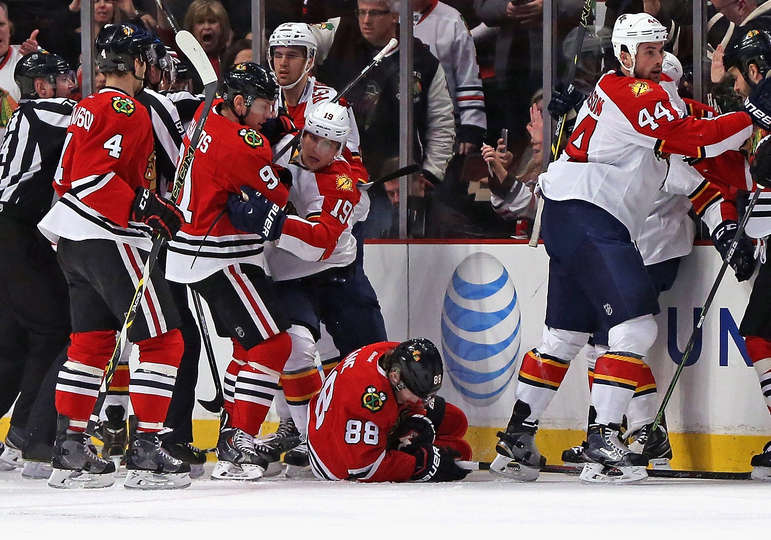 15-_DSC2491-toresizeTuesday, February 24, 2015 will forever be one of the worst days/nights in Chicago sports. During the first period of the Blackhawks’ tilt with the Florida Panthers, NHL points leader Patrick Kane was cross checked from behind and fell awkwardly into the boards. It was instantly obvious that he severely injured his left arm in some way. Then about two hours later, news broke that Derrick Rose had re-torn the meniscus in his right knee. Both are expected to miss a lot of time. While the Rose injury is definitely sad and horrible for him and the Bulls, I’ll only focus on Kane and the Hawks here.